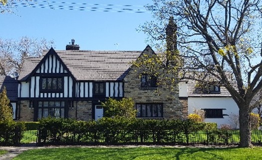 This Tudor home Constructed for Dr. Carruthers in 1934, is Sarnia’s finest example of an Elizabethan Manor. The lower storey of the front facade is constructed of cut stone with a hammered finish which is interspersed with red brick. The second storey is constructed of vertical wood beams and stucco, creating the traditional Tudor half-timbered veneer. Decorative wood trim with brackets separates the first and second floors.