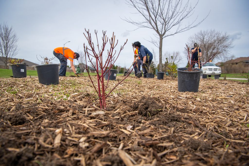 The City’s forestry and horticulture teams spent this past week completing the final phase of work to realize Council’s direction in enhancing the naturalized area between Modeland Road and the Rapids Parkway. Work began in the fall with the removal of overgrown vegetation and wrapped up this week with the planting of 760 native shrubs and 27 native trees across 22 planting pods in the corridor.