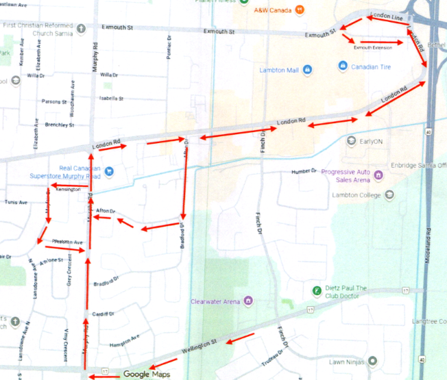 Depart Clearwater Terminal – Wellington St – Murphy Rd – London Rd – London Line/Exmouth Extension – back to London Rd – Afton – Murphy Rd – Kensington – Mayfair – Preston – Murphy Rd – Wellington St – Back to Clearwater Terminal
